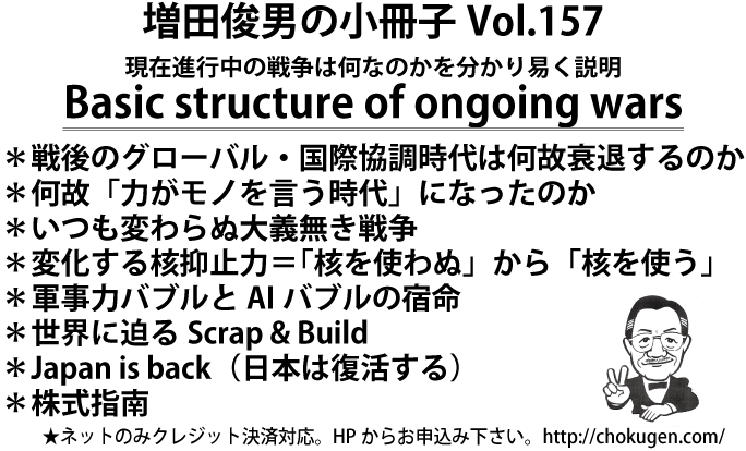 | ★「増田俊男の時事直言」別サイト ★「増田俊男の動画サイト」 [日本語URL] http://chokugen.com/ [英語URL] http://chokugen.com/e/ [日本語X(旧twitter)] t_masuda2019 [英語X(旧twitter)] T_Masuda_eng [instagram] t_masuda2019 [Youtube] 増田俊男チャンネル [ECサイト] 増田俊男のECサイト |