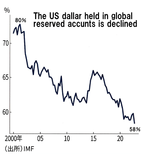 | (This issue is submitted to a Washington D.C., Seattle, and Zurich think-tank as the English edition of “Straight from Shoulder”.) "Straight from the shoulder " by Toshio Masuda-Samurai Lecturer  October, 2023 ( Free of charge to the people I met) What is the United States’ Achilles Heel? In the world of capitalism “money talks”. In the current world of finance, it is the US dollar that talks the loudest. The United States’ Federal Reserve Bank (FRB) has the power to increase or decrease the US dollar supply. The US is the only country in the world that has been capitalizing on being the owner of the world’s principal international currency. As long as the US dollar remains the main international basic currency, the US retains its topmost position of influence over the global economy. Any weakness of the United States would be wholly attributable to the performance - i.e. the capacity - of its currency. This capacity is based on the quantity of US dollars used in international transactions. The following chart illustrates the share of US dollar in foreign reserves held by world’s central banks.  Twenty years ago the reserves of world’s central banks consisted in 80% of UD dollar; now the figure is less than 58%.  China used to be No. 1 holder of the US dollar on its reserve accounts of $1.2 trillion; now this figure has shrunk to around 0.8 trillion. In 2018 Japan occupied No.2 position with its $1.0 trillion reserves; by 2021 this figure rose to $1.3 trillion, only to shrink below $1.2 in 2023. Following the invasion of Ukraine, in February 2022, the US-led sanctions imposed on Russia and her trading partners included expulsion from the SWIFT mechanism, forcing them to abandon US dollar in their international trades. Instead, they had to use their own national currencies or join in the CIPS - (Cross-border Interbank Payment System) that settled accounts through the People’s Bank of China. The de-dollarization process has subsequently been accelerated by the US sanctions imposed on any country considered to be an enemy, or unfriendly. Currently the de-dollarisation process can be seen all around. Anti-American countries, or those unfriendly towards America don’t have to follow Mr Putin, who has been insisting on de-dollarisation. Following him would move America to retaliate against. Since 1974 Saudi Arabia and other Middle East oil producers have been accepting only the US dollar in payment for their oils, thus securing the value of petrodollar. In exchange, their securities were guaranteed by the US. The petrodollar system has underpinned the US dollar’s value ever since. Then having recognized that the US last troops withdrew from Afghanistan in 2021, MBS (Mohammad bin Salman, the Crown Prince and the Prime Minister of Saudi Arabia) announced that in the near future Saudi Arabia may accept Chinese renminbi in payment for its oil; other oil-producing countries are following. Sooner or later the petrodollar system will collapse. If Putin and Xi Jinping wish to stop the US dollar being the world’s principal trading currency, they do not need to put any effort into it. All they have to do is to sit back and mind their own businesses. America’s Achilles Heel is nothing more than TIME. Focus on TIME. Because “TIME talks!” Samurai MASUDA www.chokugen.com/e/ Any question to: tmasuda2010@live.jp Anyone wanting to redistribute Straight from the Shoulder pieces or  excerpts from the texts should direct their request in advance to the Toshio Matsuda Office at Sunraworld, Ltd. (Tel: 81-(0)3-3955-6686). | |